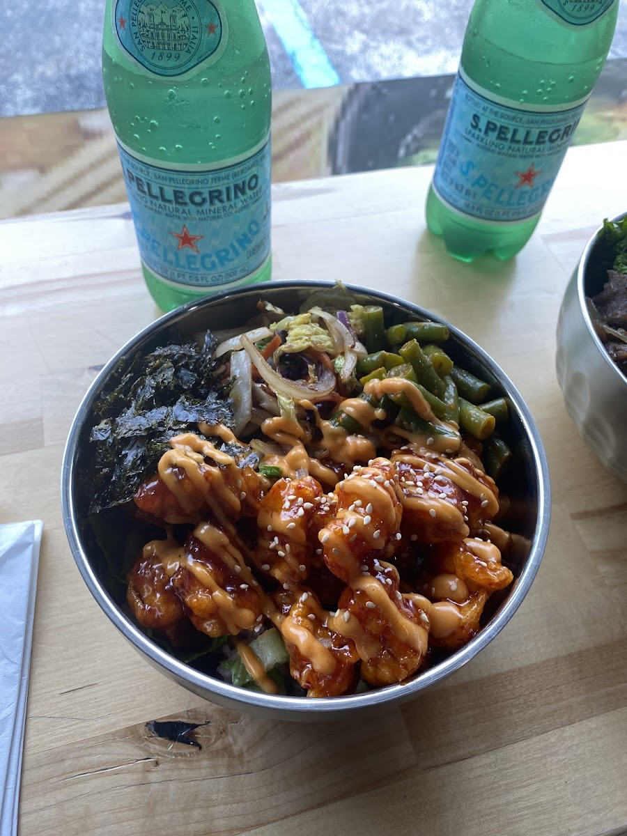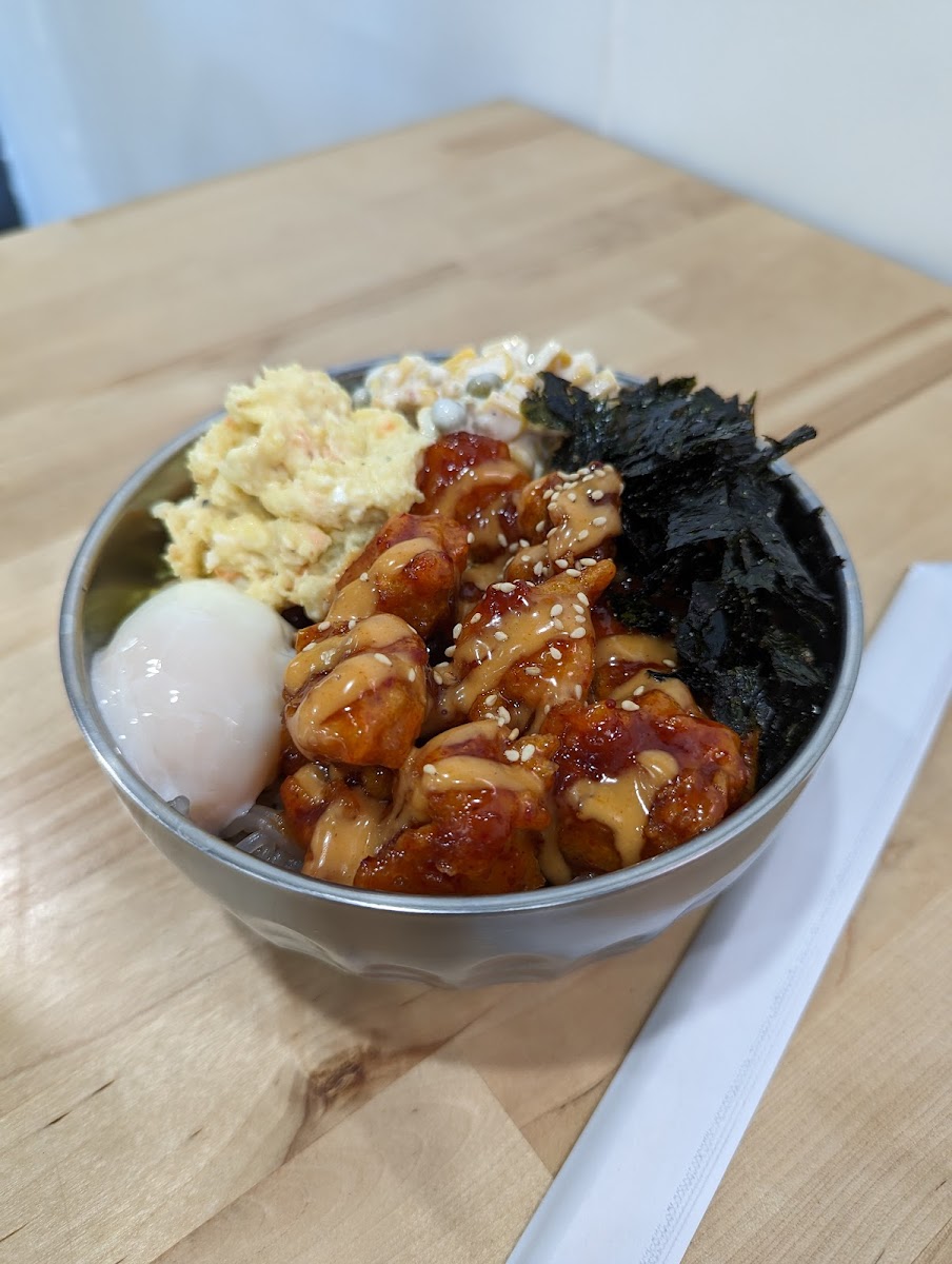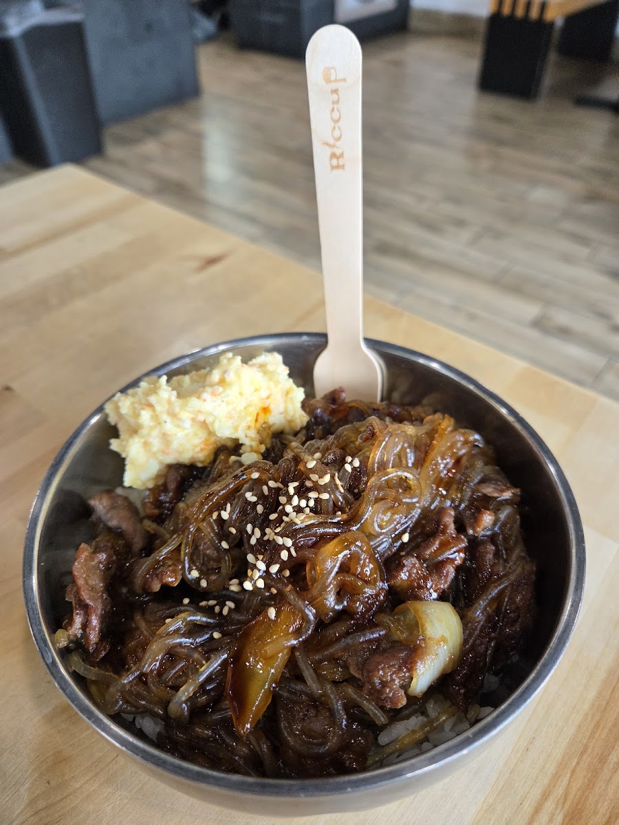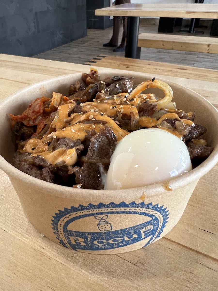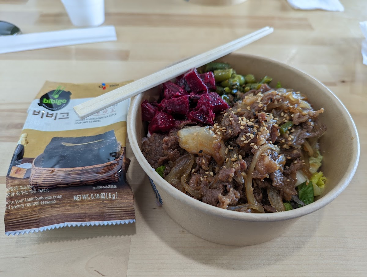 This place is excellent for a good bulgogi beef bowl. The portion is full but not overwhelmingly so. The only food item on the menu is the build your own bowl. I ordered Base: white rice Meat: bulgogi beef (comes with sweet potato glass noodles) Toppings (pick 3!): 1 - poached egg 2 - potato salad 3 - cheesy corn I highly recommend and would love to return and plan too very soon. I recommend trying them very much